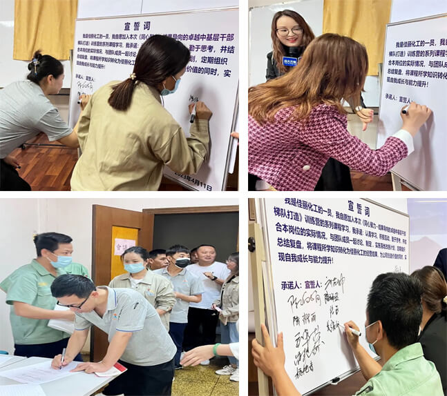 此次訓練營基于佳麗化工現(xiàn)階段發(fā)展瓶頸問題,定制系列課程,采用“認知改變-主題邏輯-方法論-實施步驟-工具表單-案例講解-小組演練-上臺分享-講師點評”的教學方式,每節(jié)課圍繞3個核心內(nèi)容講深講透,并結(jié)合主題內(nèi)容制定可落地實施的具體動作,確保課后得到有效應用。