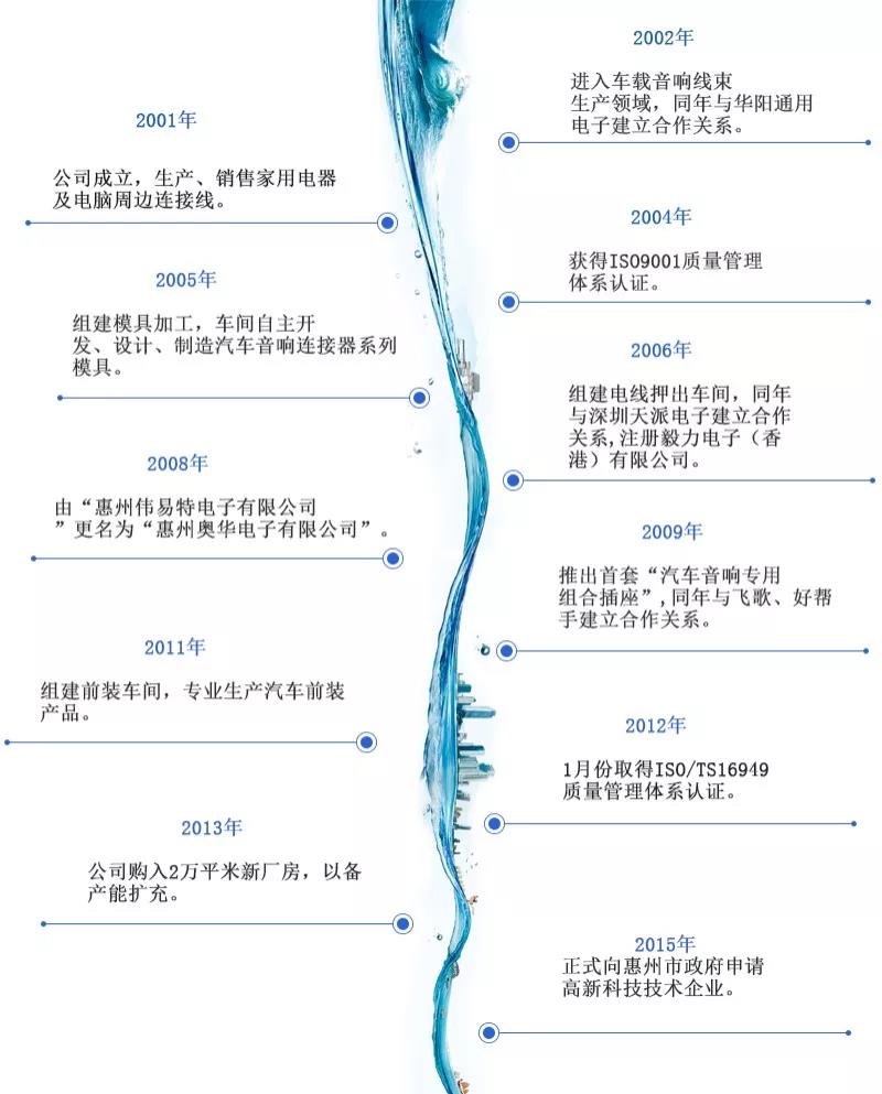 惠州奧華電子有限公司成立于2001年,公司占地面積10000平方米,建筑面積12000平方米,員工600余人。擁有一批優(yōu)秀的研發(fā)、技術(shù)、生產(chǎn)管理人才。專業(yè)開發(fā)、生產(chǎn)、銷售汽車插座、線束、精密連接器等汽車部件。具有汽車連接器全程制造能力,包括精密模具、塑膠成型、五金沖壓、電線電纜、零部件及線束生產(chǎn)。公司產(chǎn)品已廣泛應(yīng)用于汽車音響、空調(diào)、防盜器、GPS導(dǎo)航、天窗、倒車?yán)走_(dá)、電動(dòng)門窗、儀表等汽車電子行業(yè),并與國(guó)內(nèi)外電子企業(yè)建立了良好的合作伙伴關(guān)系。