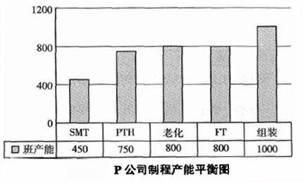 (4)其他。當(dāng)設(shè)備比較昂貴時,管理及財務(wù)人員有傾向提高稼動率,生產(chǎn)過多的產(chǎn)品。下圖是P公司的一個案例,其內(nèi)部各制程分別是SMT-PTH-老化-FT-組裝,其產(chǎn)能分布如下: