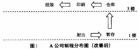 本制程為:1樓的射出完成后,由于后面的印刷效率遠(yuǎn)遠(yuǎn)大于輸出,所以射出后產(chǎn)品只能先入庫,經(jīng)過印刷后,要先在1樓暫存,等當(dāng)班結(jié)束時再入3樓的倉庫,后一個制程-組裝需要時來3樓的倉庫領(lǐng)取。這個流程中有入存2次,WIP I次,勢必造成制造過早的浪費。