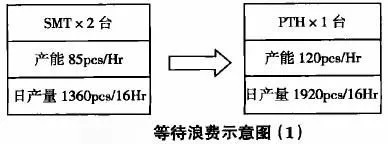PTH日產(chǎn)量1920pce/16Hr,SMT日產(chǎn)量1360pce/16Hr,這樣安排的話,PTH制程上班的16個小時中有4.6個小時人和機(jī)處于等待狀態(tài)。