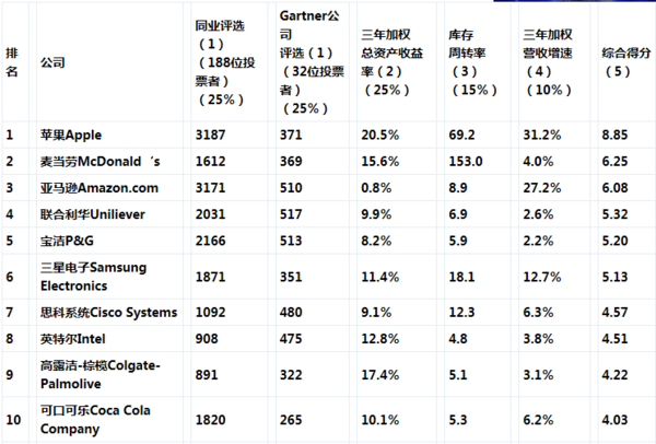 首先我們看一下2014年全球供應(yīng)鏈運(yùn)營(yíng)管理的公司有哪些,排在前頭的是蘋果,綜合評(píng)分8.85,第二位麥當(dāng)勞公司。