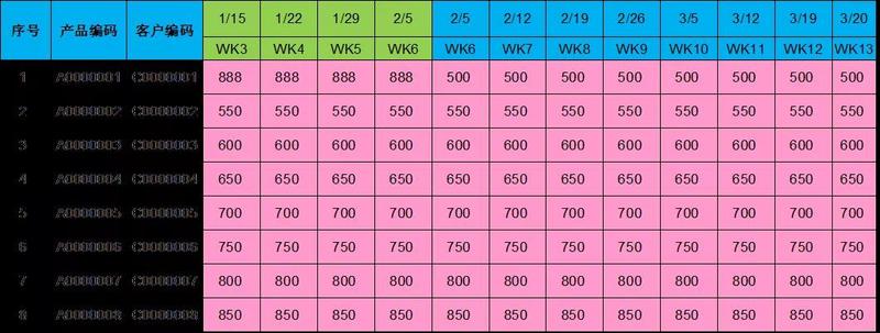不同企業(yè)選擇也不盡相同,客戶需求穩(wěn)定一般所采用的是前兩者;一份Shipping plan報(bào)表,一般前面幾周是正式PO訂單模式,后面數(shù)周是FORECAST需求模式;以下是簡(jiǎn)易版SHIPPING PLAN,如截圖2: