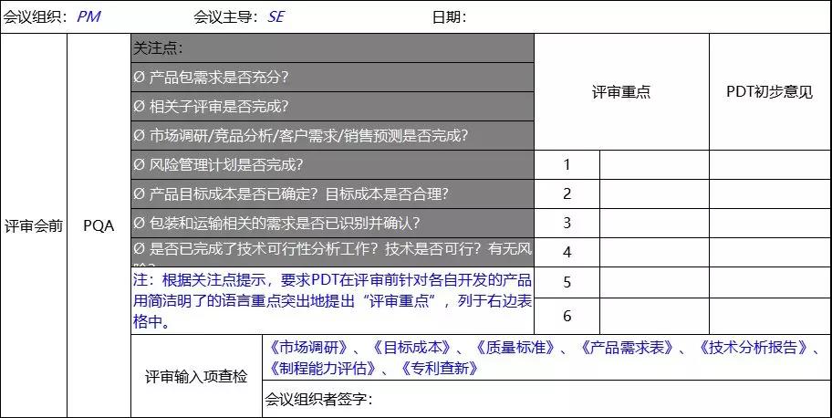 評審過程需要有人負責,一般來講系統工程師是技術指導者,PQA是過程主持人, PDT核心組成員反映部門問題,代表本領域提出專業(yè)意見,并代表功能部門承擔責任,項目領導以業(yè)務需要為出發(fā)點對技術問題做決策。