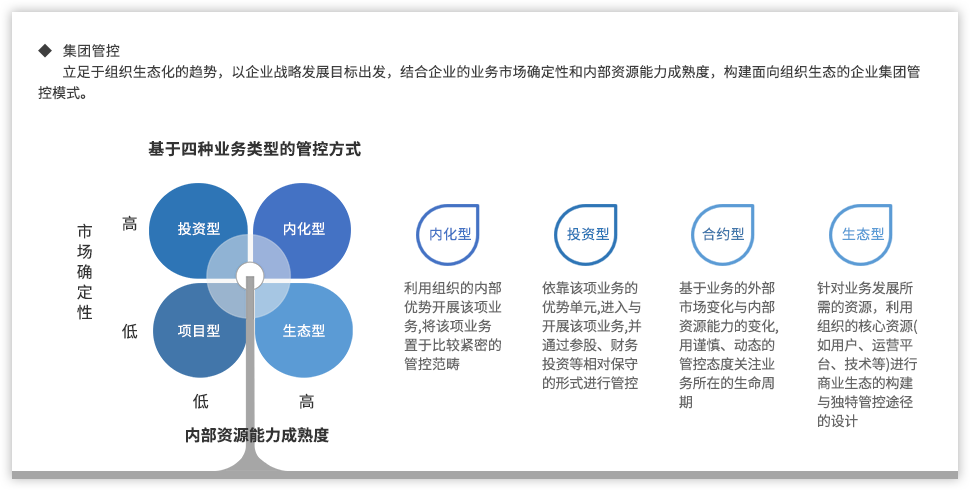 遠大方略認為,為了強化國有企業(yè)組織管控能力,企業(yè)需要以戰(zhàn)略發(fā)展目標(biāo)為出發(fā)點,從組織架構(gòu)、集團管控、業(yè)務(wù)流程、風(fēng)險管理、財務(wù)管控等各個方面進行全面提升,構(gòu)建系統(tǒng)全面的管控體系。