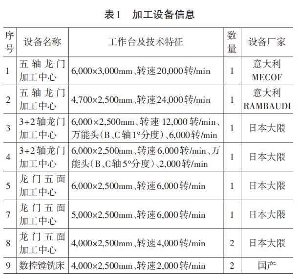 加工設備包括龍門五面加工中心4臺,五軸龍門加工中心2臺,3+2軸龍門加工中心2臺,數(shù)控機床2臺,搖臂鉆床3臺,能夠滿足承接各類汽車模具覆蓋件加工需求,主要加工設備情況如表1所示。