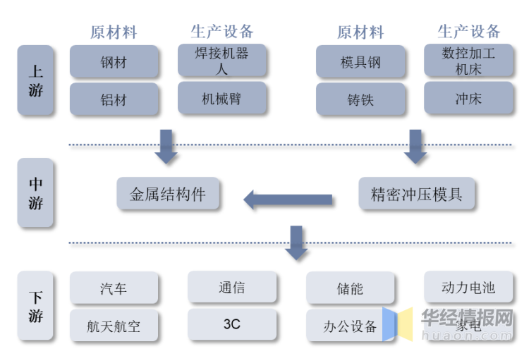 從沖壓模具產(chǎn)業(yè)鏈來看,精密沖壓模具和金屬結(jié)構(gòu)件上游主要為鋼材、鋁材、模具鋼等原材料以及焊接機器人、機械臂、沖床等生產(chǎn)設(shè)備;下游應(yīng)用領(lǐng)域包括汽車、通信、儲能、動力電池等。