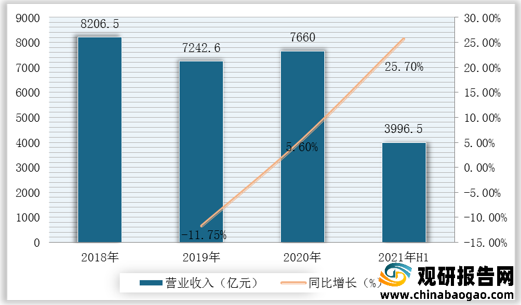 2018-2021年H1儀器儀表制造業(yè)營(yíng)業(yè)收入及增速