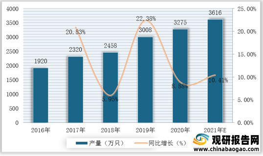 2016-2021年我國(guó)智能水表產(chǎn)量、增速及預(yù)測(cè)