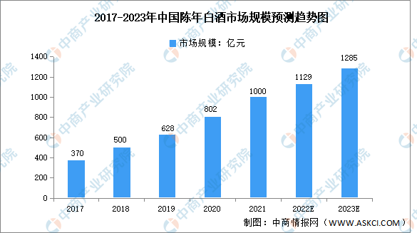 陳年白酒是由具備白酒生產(chǎn)資質(zhì)企業(yè)以傳統(tǒng)白酒工藝釀造,出廠(chǎng)10年以上,且保存完好的白酒產(chǎn)品。近年來(lái),茅臺(tái)酒、五糧液、汾酒、瀘州老窖特曲等品牌的陳年酒市場(chǎng)規(guī)模高速增長(zhǎng),由2017年的370億元增長(zhǎng)至2021年的1000億元,復(fù)合年均增長(zhǎng)率達(dá)28.2%。未來(lái),隨著國(guó)民消費(fèi)水平進(jìn)一步提高,預(yù)計(jì)2023年我國(guó)陳年白酒市場(chǎng)規(guī)模將達(dá)1285億元。
