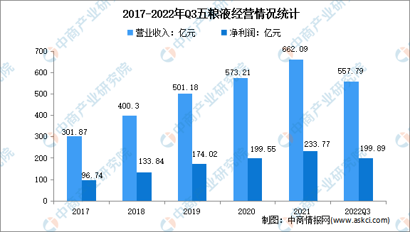 五糧液主要產(chǎn)品“五糧液酒”是我國(guó)濃香型白酒的典型代表。同時(shí),五糧液根據(jù)生產(chǎn)工藝特點(diǎn)開(kāi)發(fā)了五糧春、五糧醇、五糧特曲、尖莊等品類(lèi)齊全、層次清晰的系列酒產(chǎn)品。2021年,五糧液營(yíng)業(yè)收入達(dá)662.09億元,凈利潤(rùn)實(shí)現(xiàn)233.77億元。2022年前三季度實(shí)現(xiàn)營(yíng)業(yè)收入557.79億元,凈利潤(rùn)199.89億元。