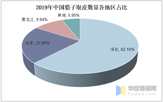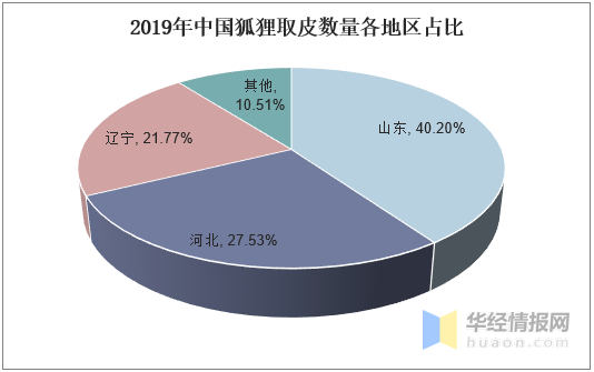 中國水貂、狐貍、貉子主要的養(yǎng)殖區(qū)位山東、遼寧、黑龍江、河北等地。根據(jù)數(shù)據(jù)顯示,山東是水貂的主要養(yǎng)殖區(qū),2019年山東水貂取皮數(shù)量占全國水貂取皮數(shù)量的56.79%;其次為遼寧和黑龍江,水貂取皮數(shù)量分別占據(jù)總?cè)∑?shù)量的26.51%、9.82%。