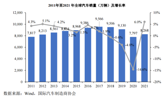 2020年,全球汽車市場低迷,汽車銷量下降至7,797萬輛,隨著經(jīng)濟形勢逐步好轉,汽車市場逐漸回暖,2021年全球汽車銷量約8,268萬輛。