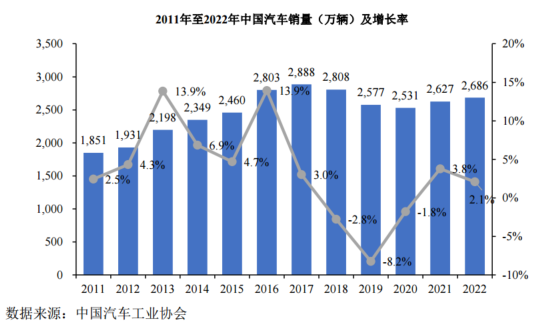 根據(jù)中國汽車工業(yè)協(xié)會統(tǒng)計,2022年,中國汽車銷量約2,686萬輛,同比增長2.1%。