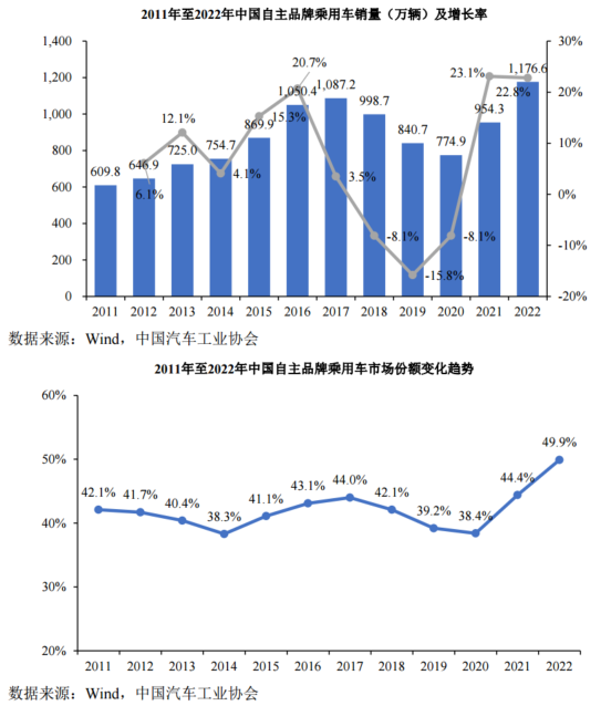 根據(jù)中國汽車工業(yè)協(xié)會統(tǒng)計,2022年,中國乘用車銷量約2,356.3萬輛,增速達到9.5%,創(chuàng)近六年來新高。其中,自主品牌乘用車銷量約1,176.6萬輛,占乘用車市場份額約49.9%,實現(xiàn)大幅增長。