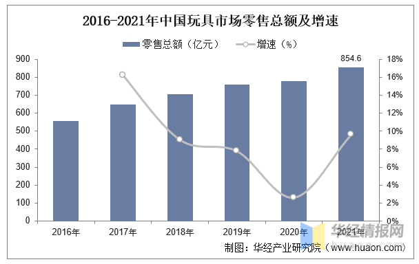 隨著我國玩具制造業(yè)持續(xù)發(fā)展,零售規(guī)模穩(wěn)定增長。根據(jù)中國玩具和嬰童用品協(xié)會數(shù)據(jù),從2016年到2021年,我國玩具市場零售總額逐年增長,從556億元增長至854.6億元,年復(fù)合增長率為8.98%,行業(yè)發(fā)展態(tài)勢良好,市場空間不斷拓展。