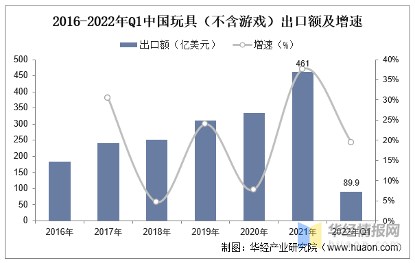 我國玩具產(chǎn)業(yè)重出口,工業(yè)化程度高但多以代工貼牌模式進行。根據(jù)中國玩具和嬰童用品協(xié)會數(shù)據(jù),2021年中國玩具(不含游戲)出口額達到461億美元,同比增長37.6%。2022年一季度,中國玩具(不含游戲)累計出口額為89.9億美元,較2021年同期增長19.4%