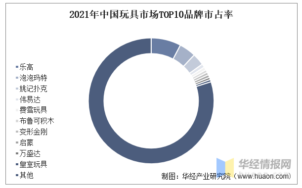 與發(fā)達國家相比,我國玩具行業(yè)目前市場格局較為分散,國產(chǎn)玩具品牌的市占率和影響力在國內(nèi)仍整體偏弱。2021年,在中國玩具市場TOP10品牌中,樂高占據(jù)領(lǐng)導(dǎo)地位,占比7.7%。其次是泡泡瑪特,達到4.3%的市占率,排名第二,第三名為姚記撲克,市占率為3.1%,其余玩具品牌占比均不足1%。