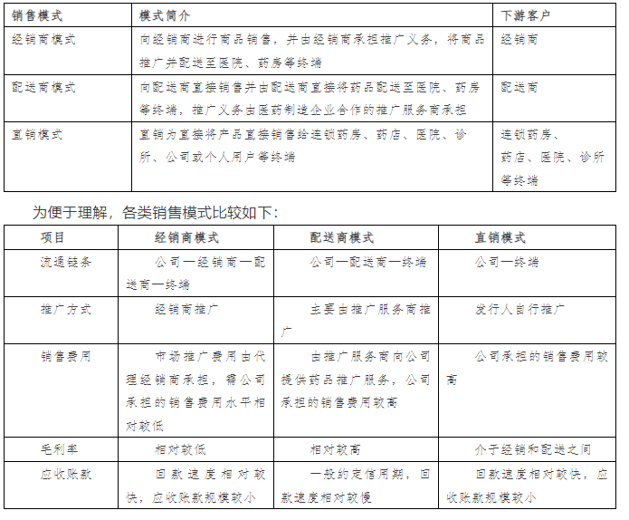 醫(yī)藥制造企業(yè)的銷售模式包括經(jīng)銷商模式、配送商模式、直銷模式,其主要區(qū)別在于推廣方式及銷售費用的承擔。具體情況如下: