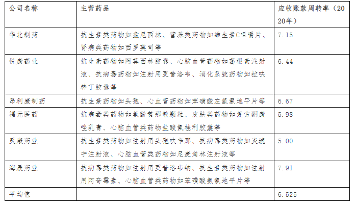 醫(yī)藥制造企業(yè)普遍存在應收賬款較大的現(xiàn)象,原因是其下游客戶公立醫(yī)院等較為強勢。另經(jīng)對比研究上市公司2020年公開數(shù)據(jù),得出結論醫(yī)藥制造行業(yè)平均應收賬款周轉率一般在5-7之間(按產(chǎn)品細分領域不同可能存在一定差異)。