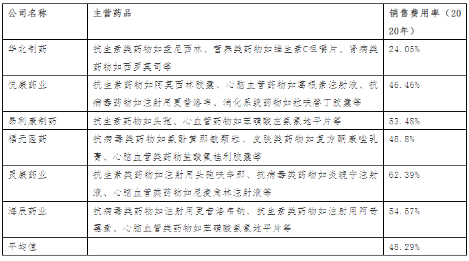在醫(yī)藥制造行業(yè)中營銷極為重要,由于兩票制政策的出臺,目前大部分藥品的營銷費用都由藥企承擔,并通過業(yè)務推廣費體現(xiàn)。經(jīng)對比研究上市公司2020年公開數(shù)據(jù),得出結論醫(yī)藥制造行業(yè)平均銷售費用率(銷售費用/營業(yè)收入)在40%-60%之間(按產(chǎn)品細分領域不同可能存在一定差異)。