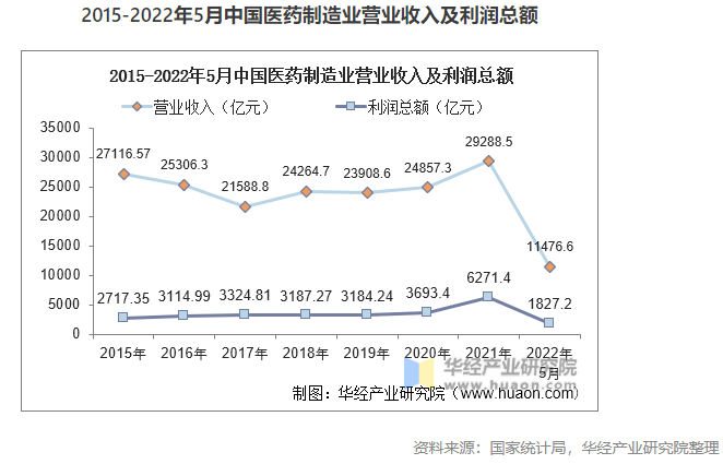2016年,醫(yī)藥制造業(yè)由于受到一系列政策調(diào)控和企業(yè)轉(zhuǎn)型的影響,藥品價(jià)格受到嚴(yán)格監(jiān)管和控制,行業(yè)整體營(yíng)業(yè)收入出現(xiàn)下滑,隨后市場(chǎng)競(jìng)爭(zhēng)環(huán)境改善,營(yíng)業(yè)收入逐漸恢復(fù)增長(zhǎng)趨勢(shì),2021年中國(guó)醫(yī)藥制造業(yè)的營(yíng)業(yè)收入為29288.5億元,利潤(rùn)總額為6271.4億元,利潤(rùn)率為21.4%,截至2022年5月,我國(guó)醫(yī)藥制造業(yè)2022年利潤(rùn)率為15.9%。