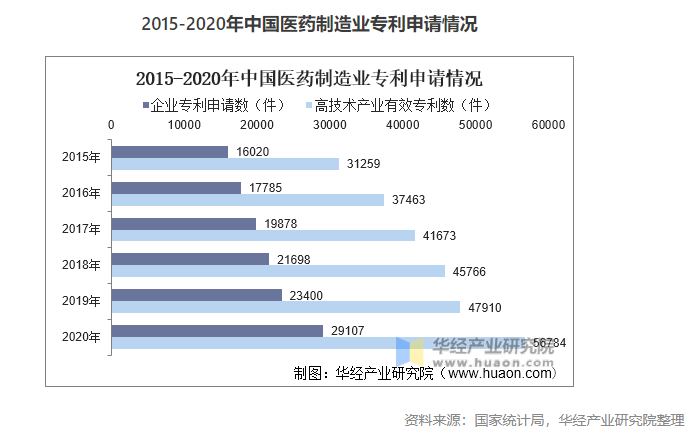 作為技術(shù)含量最高的行業(yè)之一,醫(yī)藥制造業(yè)必須不斷投入新藥品的研發(fā),提升行業(yè)整體創(chuàng)新能力和研發(fā)水平,才能提高醫(yī)藥制造業(yè)的競(jìng)爭(zhēng)力。根據(jù)國(guó)家統(tǒng)計(jì)局?jǐn)?shù)據(jù)顯示2020年我國(guó)醫(yī)藥制造業(yè)企業(yè)專利申請(qǐng)數(shù)為29107個(gè),高技術(shù)產(chǎn)業(yè)專利有效數(shù)56784件,同比增長(zhǎng)18.7%
