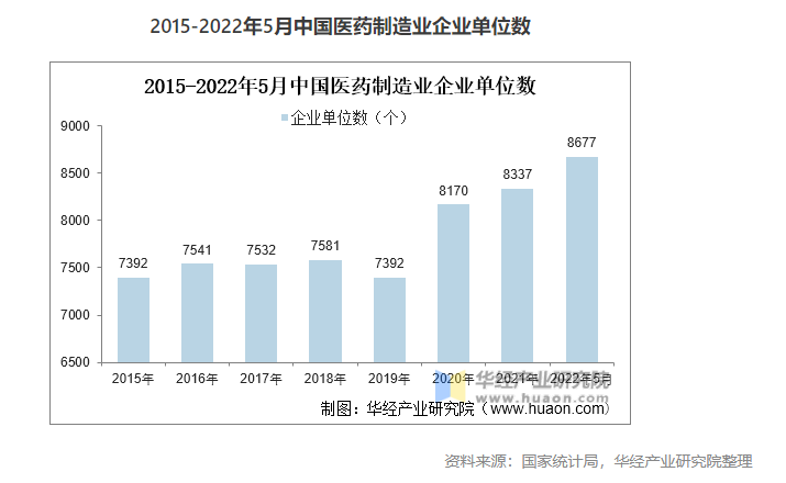 疫情前,受政策控制和行業(yè)嚴(yán)格監(jiān)管的影響,我國(guó)醫(yī)藥制造業(yè)企業(yè)單位數(shù)量較為穩(wěn)定,研發(fā)能力較弱的中小型企業(yè)逐漸退出市場(chǎng),2020年疫情席卷全球,市場(chǎng)迫切需要大量藥品和疫苗研發(fā),企業(yè)數(shù)量開(kāi)始增長(zhǎng),截止2022年5月我國(guó)醫(yī)藥制造業(yè)企業(yè)有8677家。