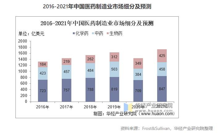 醫(yī)藥制造業(yè)三大種類中,化學(xué)藥的市場(chǎng)占比最多,化學(xué)藥主要用于人體疾病防治、診斷。應(yīng)用領(lǐng)域較為廣泛和普及,2020年我國(guó)化學(xué)藥市場(chǎng)規(guī)模大709億美元,占比49.2%;生物藥憑借其藥理活性高、特異性強(qiáng)、治療效果好等特點(diǎn),越來(lái)越受市場(chǎng)關(guān)注,其市場(chǎng)規(guī)模由2016年的184億美元增長(zhǎng)至2020年的349億美元。慢性病的治療周期較長(zhǎng),我國(guó)中藥在慢性病的治療中具有不可替代的作用,2021年我國(guó)中藥制造企業(yè)規(guī)模預(yù)計(jì)為458億美元。