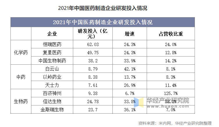 隨著藥品審評(píng)審批制度改革、國(guó)家醫(yī)保常態(tài)化調(diào)整等政策改革,“創(chuàng)新”逐漸成為藥企的發(fā)展理念?;瘜W(xué)制藥行業(yè)正在發(fā)生結(jié)構(gòu)性變化,隨著仿制藥出現(xiàn)藥品價(jià)格持續(xù)下降的同時(shí),行業(yè)集中度也有望提升;中醫(yī)藥行業(yè)政策利好不斷,相關(guān)部門(mén)從市場(chǎng)準(zhǔn)入、醫(yī)保支付、審評(píng)審批等多個(gè)維度對(duì)中醫(yī)藥行業(yè)形成政策支撐,中藥原材料價(jià)格上漲對(duì)企業(yè)決策也造成一定的影響;生物藥雖然起步晚于化學(xué)藥,但近年來(lái)卻受全球藥企熱捧,成為藥企和投資者競(jìng)爭(zhēng)的新方向,研發(fā)投入力度較大。