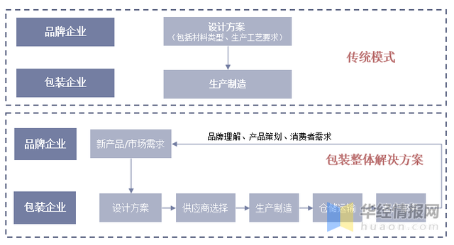隨著全球化競爭的進一步加劇和價值鏈分工日益細化,印刷包裝行業(yè)的下游客戶將資源集中應(yīng)用于發(fā)展核心業(yè)務(wù)和競爭優(yōu)勢,將諸如產(chǎn)品包裝的非核心業(yè)務(wù)外包,以縮短和優(yōu)化供應(yīng)鏈流程提升效率并降低成本。印刷包裝企業(yè)開始參與和推動下游客戶價值鏈的整合和優(yōu)化,由產(chǎn)品的提供商逐步轉(zhuǎn)型為包裝解決整體解決方案提供商,推動印刷包裝行業(yè)向“包裝整體解決方案”的經(jīng)營模式轉(zhuǎn)型。