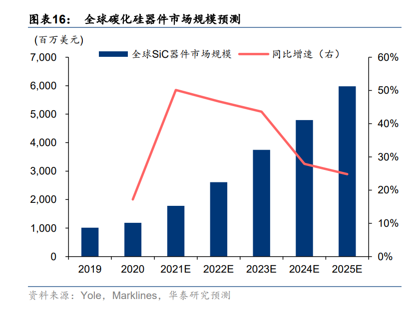 2020 年全球 SiC 器件市場規(guī)模達 11.84 億美元,預(yù)計到 2025 年有望增長至 59.79 億美元,對應(yīng)復(fù)合年均增長率為 38.2%。根據(jù)測算,在碳中和趨勢下,受益于 SiC 在新能源汽車、光 伏、風(fēng)電、工控等領(lǐng)域的持續(xù)滲透,SiC 功率器件市場規(guī)模有望從 2020 年的 2.92 億美元增長至 2025 年的 38.58 億美元,對應(yīng)復(fù)合年均增長率為 67.6%;以及在5G通信、下游SiC功率及射頻器件高速增長的需求也將帶動 SiC 材料市場規(guī)??焖俪砷L。