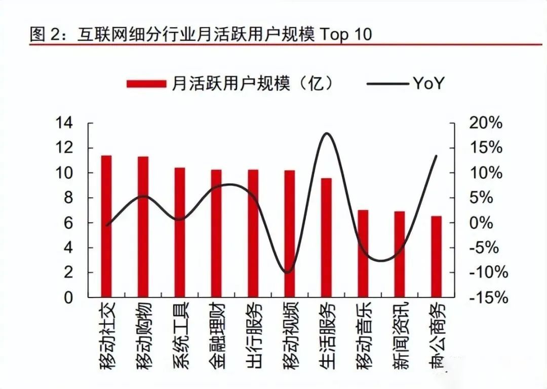 國(guó)內(nèi)互聯(lián)網(wǎng)滲透率已達(dá)較高水平,流量紅利基本見(jiàn)頂。根據(jù) Questmobile,截至 2022 年 12 月,中國(guó)移動(dòng)互聯(lián)網(wǎng)月活躍用戶(hù)規(guī)模達(dá)到 12.03 億,根據(jù)第七次人口普查數(shù)據(jù),我國(guó) 10-79 歲人口約 12.09 億,互聯(lián)網(wǎng)用戶(hù)滲透率已達(dá)較高水平。2022 年 6 月,移動(dòng)社交/ 移動(dòng)購(gòu)物/系統(tǒng)工 App MAU 分別達(dá) 11.43/11.36/10.45 億(Questmobile),騰訊系/頭條系/阿里系/百度系 App 滲透率分別達(dá)98.6%/89.5%/96.2%/91.8%(月狐數(shù)據(jù)),頭部平臺(tái)滲透率接近天花板,流量紅利基本見(jiàn)頂。