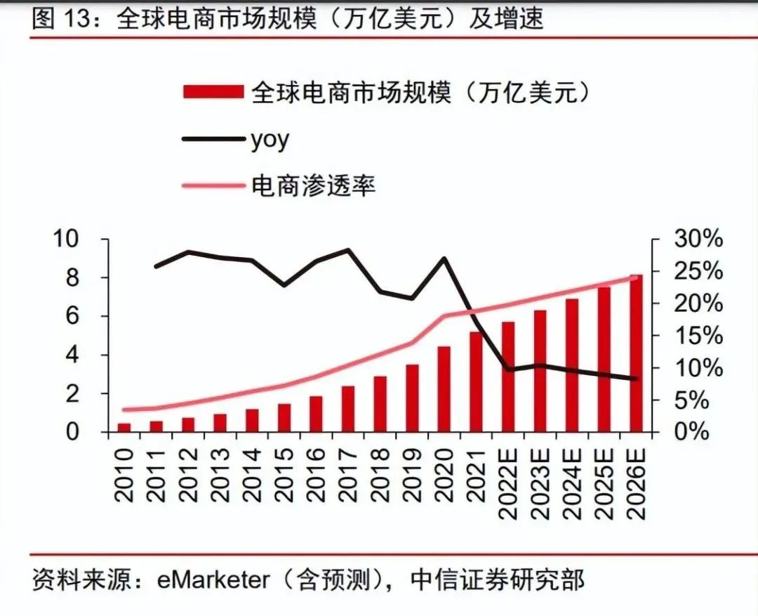 疫后消費(fèi)線(xiàn)上化趨勢(shì)延續(xù),2026 年全球電商滲透率有望達(dá) 24%。疫情加速培育全球用戶(hù)電商消費(fèi)習(xí)慣,根據(jù) eMarketer,全球電商市場(chǎng)規(guī)模 2019-2021 年 CAGR 為 22%。盡管全球疫情已進(jìn)入常態(tài)化防控階段,但消費(fèi)者線(xiàn)上購(gòu)物的習(xí)慣仍然得以保持,根據(jù)相關(guān)數(shù)據(jù)顯示,疫情后依然會(huì)偏好線(xiàn)上購(gòu)物的用戶(hù)數(shù)在不同品類(lèi)提升 5%-15%。消費(fèi)線(xiàn)上化趨勢(shì)下,根據(jù) eMarketer,預(yù)計(jì) 2026 年全球電商市場(chǎng)規(guī)模有望達(dá) 8.1 萬(wàn)億美元,2022-2026 年 CAGR 為 9%,2026 年全球電商滲透率有望達(dá) 24%。