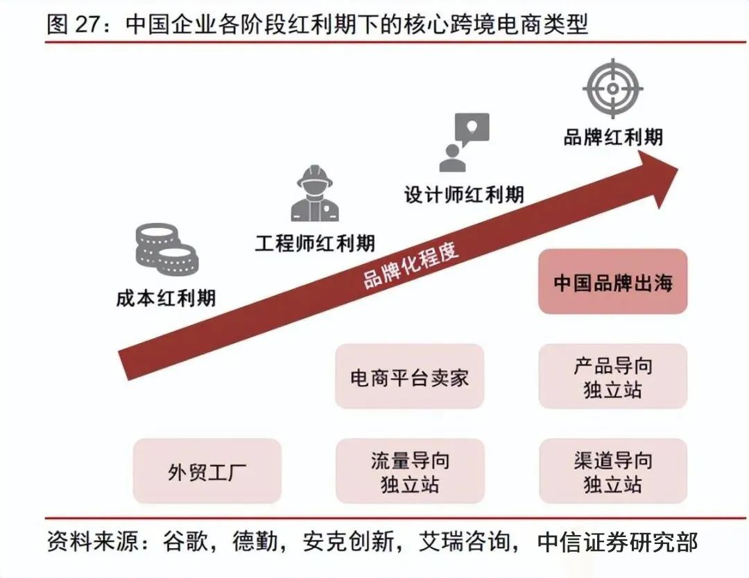早期,憑借國(guó)內(nèi)的勞動(dòng)力優(yōu)勢(shì),中國(guó)制造的高性?xún)r(jià)比產(chǎn)品快速打開(kāi)海外市場(chǎng),但也帶 來(lái)了消費(fèi)者價(jià)格敏感、用戶(hù)粘性及心智較差等問(wèn)題。經(jīng)過(guò)二十余年發(fā)展,隨著我國(guó)跨境電商模式的逐漸成熟、產(chǎn)業(yè)鏈布局的逐漸深入,以及行業(yè)競(jìng)爭(zhēng)的日益激烈,國(guó)內(nèi)跨境電商賣(mài)家正在實(shí)現(xiàn)從中國(guó)制造到中國(guó)品牌的升級(jí),以提升消費(fèi)者心智并強(qiáng)化議價(jià)能力。