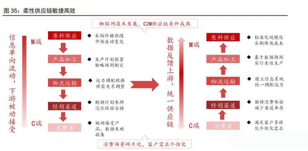 柔性供應(yīng)鏈高度敏捷,更快捕捉趨勢(shì)性機(jī)會(huì)。中國(guó)供應(yīng)鏈高度靈活敏捷,對(duì)傳統(tǒng)供應(yīng) 鏈的數(shù)字化賦能、消費(fèi)者數(shù)據(jù)的沉淀以及逆向反饋使得工廠(chǎng)具有按需生產(chǎn)的能力,大幅降 低商家?guī)齑婧统杀緣毫Γ?ldquo;小單快反”的模式也能幫助商家更快地捕捉趨勢(shì)性機(jī)會(huì)。以柔性供應(yīng)鏈的極致踐行者 Shein 為例,根據(jù) Zara 財(cái)報(bào)及晚點(diǎn) LatePost,Shein 從收到訂單 到產(chǎn)品出廠(chǎng)/庫(kù)存周轉(zhuǎn)天數(shù)只需 5/30 天,生產(chǎn)及周轉(zhuǎn)效率明顯高于 Zara、H&M,而生產(chǎn)成 本僅為 Zara 的 30%-50%。