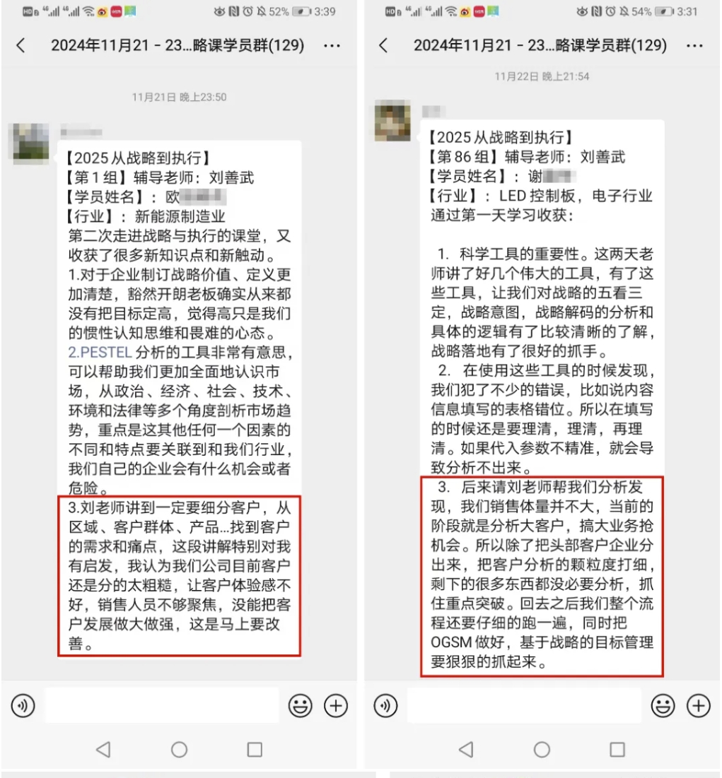 參加此次課程的學(xué)員超百人,來自不同行業(yè)不同企業(yè)的企業(yè)家、高管,更有部分企業(yè)組團(tuán)前來學(xué)習(xí),剖析差距原因,識(shí)別增長機(jī)會(huì),達(dá)成戰(zhàn)略共識(shí),助力企業(yè)長效增長。白天的高能課程讓企業(yè)受益匪淺,結(jié)束一天的課程之后,企業(yè)老板都自發(fā)的帶著自己的團(tuán)隊(duì)留下來繼續(xù)深化企業(yè)的戰(zhàn)略方案,從而實(shí)現(xiàn)從0到1的戰(zhàn)略規(guī)劃落地。