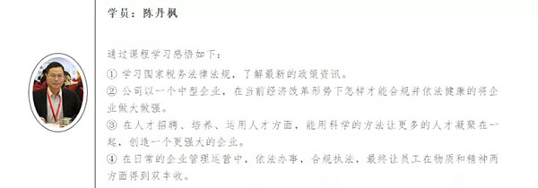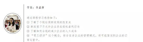 通過鄧雨薇老師的授課講解,學(xué)員們掌握了社保稅收的新政策對(duì)比變化,政策與法律對(duì)企業(yè)及個(gè)人的影響,讓學(xué)員回到企業(yè)設(shè)計(jì)出有效的落地方案。