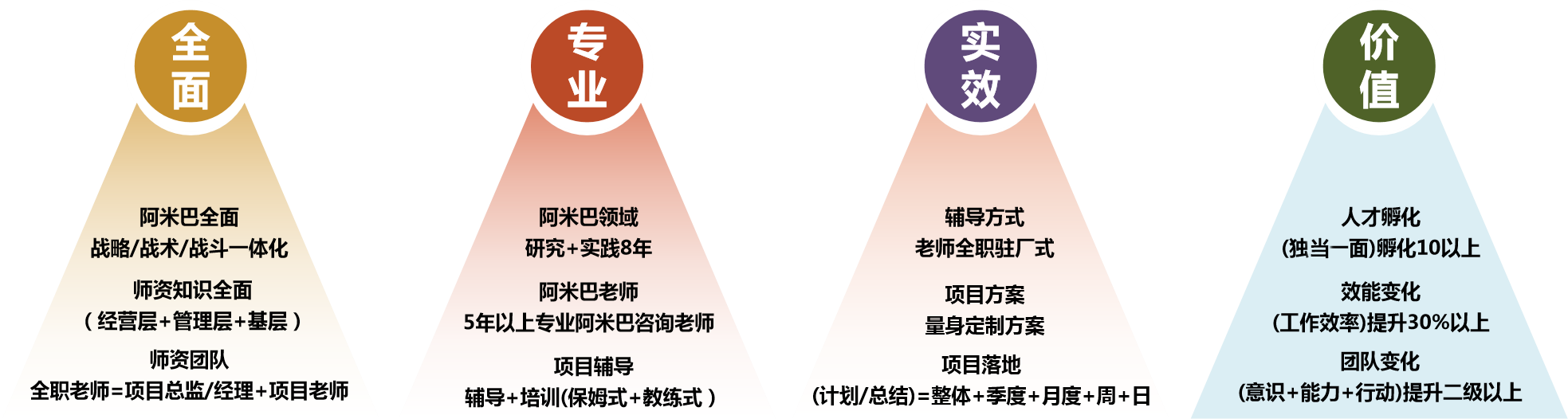 4、數(shù)據(jù)增長:(1) 公司高層、中層、基本價值觀高度統(tǒng)一;(2)公司企業(yè)文化清晰明確,提倡什么、禁止什么清楚明了;(3)組織架構(gòu)調(diào)整實施,責(zé)、權(quán)、利下放至各事業(yè)部;(4)事業(yè)部實現(xiàn)獨立財務(wù)核算;(5)事業(yè)部內(nèi)各阿米巴實現(xiàn)獨立財務(wù)核算;(6) 人才培養(yǎng)機制初步形成;(7) 持續(xù)降低成本的自主運營機制初步建立;(8)公司利潤率提升5%,凈利潤提升80%。