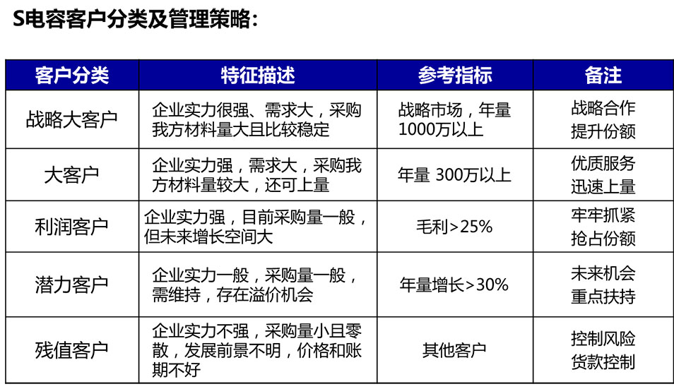 2、明確了電容業(yè)務(wù)戰(zhàn)略重點(diǎn),包括重點(diǎn)市場(chǎng)、重點(diǎn)產(chǎn)品、重點(diǎn)客戶,進(jìn)行了電容業(yè)務(wù)戰(zhàn)略布局,幫助企業(yè)建立了科學(xué)的大客戶銷售服務(wù)模式。